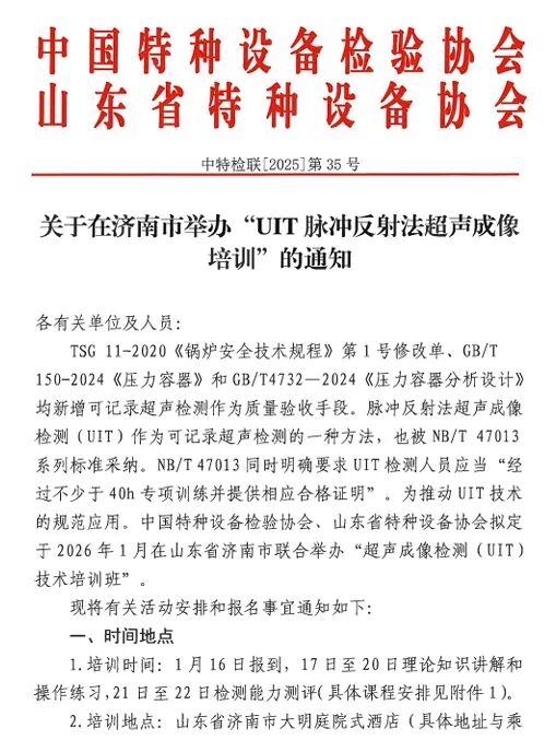 关于在济南市举办“UIT脉冲反射法超声成像培训”的通知